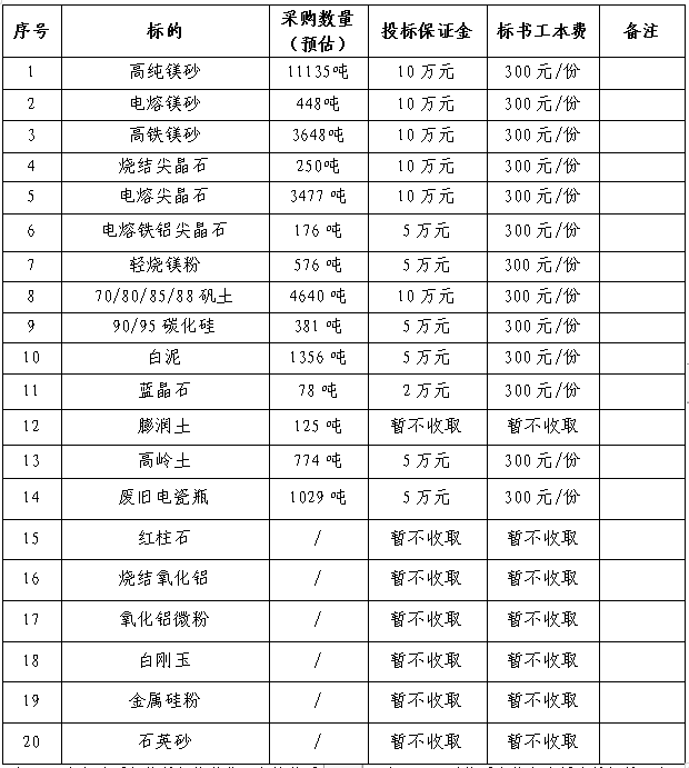 4、上述88礬土、97碳化硅、紅柱石、燒結(jié)氧化鋁、白剛玉、金屬硅粉和石英砂等招標(biāo)采購(gòu)原材料,因采購(gòu)量不確定,本次招標(biāo)僅作為本公司采購(gòu)備用原材料??紤]上述原材料存在無(wú)執(zhí)行情況,投標(biāo)保證金、標(biāo)書(shū)工本費(fèi)和合同履約保證金暫不收取。