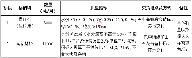 備注:標(biāo)段2可選擇目錄為“霞石粉末、制砂粉末、高鋁粘土、建筑垃圾”中的一種,也可根據(jù)自身資源填報(bào)其他物資名稱,質(zhì)量必須滿足招標(biāo)方使用,合同質(zhì)量指標(biāo)及質(zhì)量結(jié)算條款參照標(biāo)段2執(zhí)行。