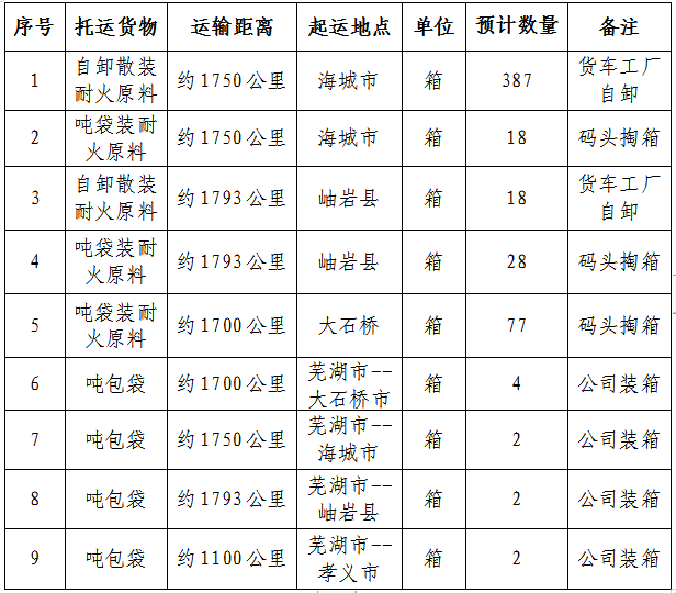 1.2起止地點:原料裝運起點為遼寧省海城市/岫巖縣/大石橋市供貨單位指定裝貨倉庫—終點安徽海螺暹羅耐火材料公司倉庫;噸袋裝運為海螺耐火材料公司倉庫至大石橋市、岫巖縣、海城市、孝義市。
