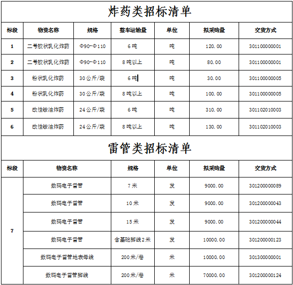 1.招標物資名稱:膠狀乳化炸藥、粉狀乳化炸藥、改性銨油炸藥、工業(yè)雷管及導(dǎo)爆管。