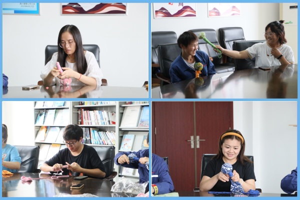 接下來,工作人員為大家準(zhǔn)備了粗布、艾草包、捶柄、棉繩等制作養(yǎng)生捶的各類材料。跟隨老師的節(jié)奏,員工們把各色粗布平攤在桌面,艾草粉末倒入粗布正中間,捏成一個緊實的圓,一個個形似話筒的養(yǎng)生錘便制作完成了。大家都迫不及待拿起親手制作的養(yǎng)生錘捶打肩頸、后背、關(guān)節(jié)等部位?!斑@個艾草錘頭比木質(zhì)的柔軟,又不像棉花那樣松軟,打在后背上真舒服,真是好看又實用!”喜愛之情溢于言表。