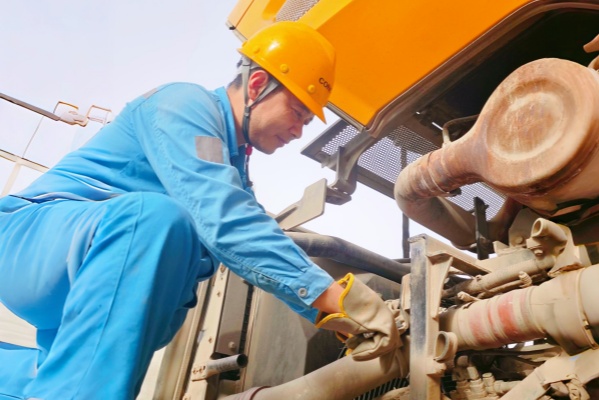 水泥分廠裝載機(jī)班長黃尤紅正在對(duì)裝載機(jī)進(jìn)行360度巡檢,確保車輛性能完好,為水泥生產(chǎn)原材料輸送效率提供可靠的保障。(楊雪峰/攝)