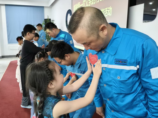工廠還為每位爸爸準備了“職場父親愛心勛章”,由孩子們親手為爸爸佩戴。制造分廠一名員工在收獲女兒的勛章以及親吻時,頓時紅了眼眶,勛章上的暖心話語-“爸爸,您是全家的支柱,有您才有家,一定要注意安全,讓我們安心”,就是女兒沒有說出來的期盼。