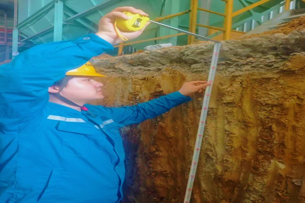 在水泥廠自動(dòng)裝車車道地基破除的周邊,“TA”用心測(cè)量著每個(gè)基礎(chǔ)鋼筋的距離,這處地基挖的孔洞明顯向南偏了20公分,那里的預(yù)埋件明顯傾斜不在水平面,“TA”指著孔洞以及前面水平儀上的刻度說,“現(xiàn)在不調(diào)整,等混凝土澆筑后地基不牢固或者偏移過大就是大問題”。