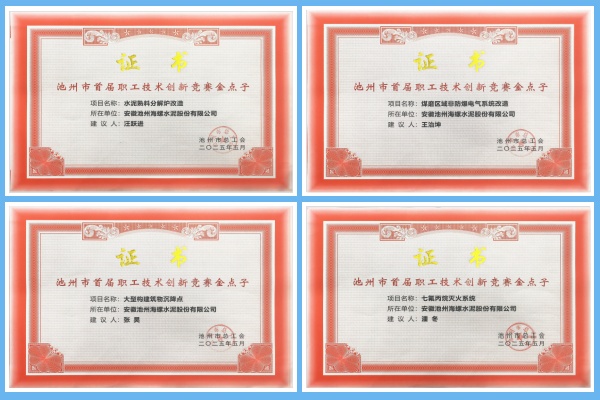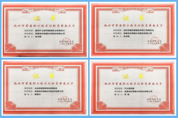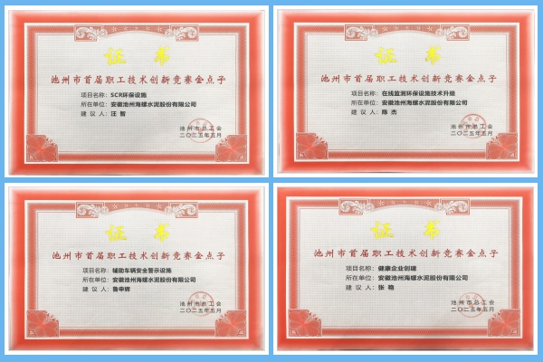 2025年11月,池州海螺榮獲池州市總工會頒發(fā)的多項(xiàng)證書嘉獎(jiǎng),以表彰其在池州市首屆職工技術(shù)創(chuàng)新競賽中所取得的優(yōu)異成績。